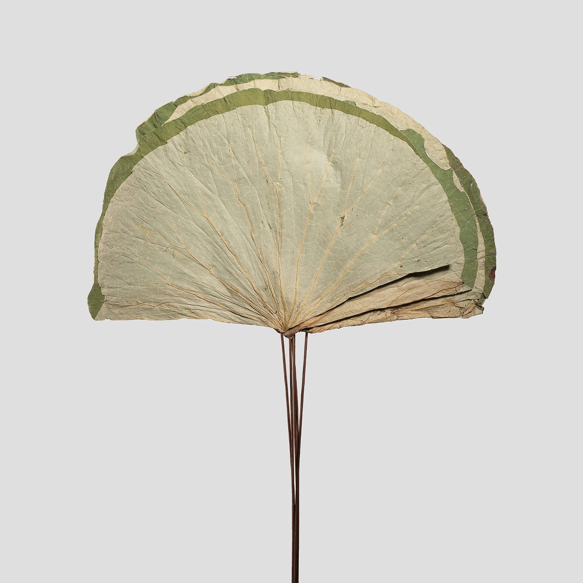 Il Loto, conosciuto anche come Nelumbo Nucifera è una pianta acquatica perenne originaria delle regioni tropicali dell'Asia e del Medio Oriente, dove cresce spontaneamente nelle paludi, nei fiumi e nei laghi. La superficie della foglia di loto essiccata è caratterizzata da una texture fine e sottile che le conferisce un aspetto delicato e leggero. Raccolta a ventaglio, presenta le caratteristiche venature che si diramano dal centro verso i bordi, creando un motivo affascinante e distintivo.
